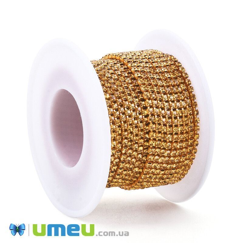 У котушці приблизно 9 м.Стразовий ланцюг SS14(3,2 мм), Золото, Стрази скляні білі АВ (ZEP-047567) / 1 мZEP-047567 Кратно 0.1 едДаний товар можна купити