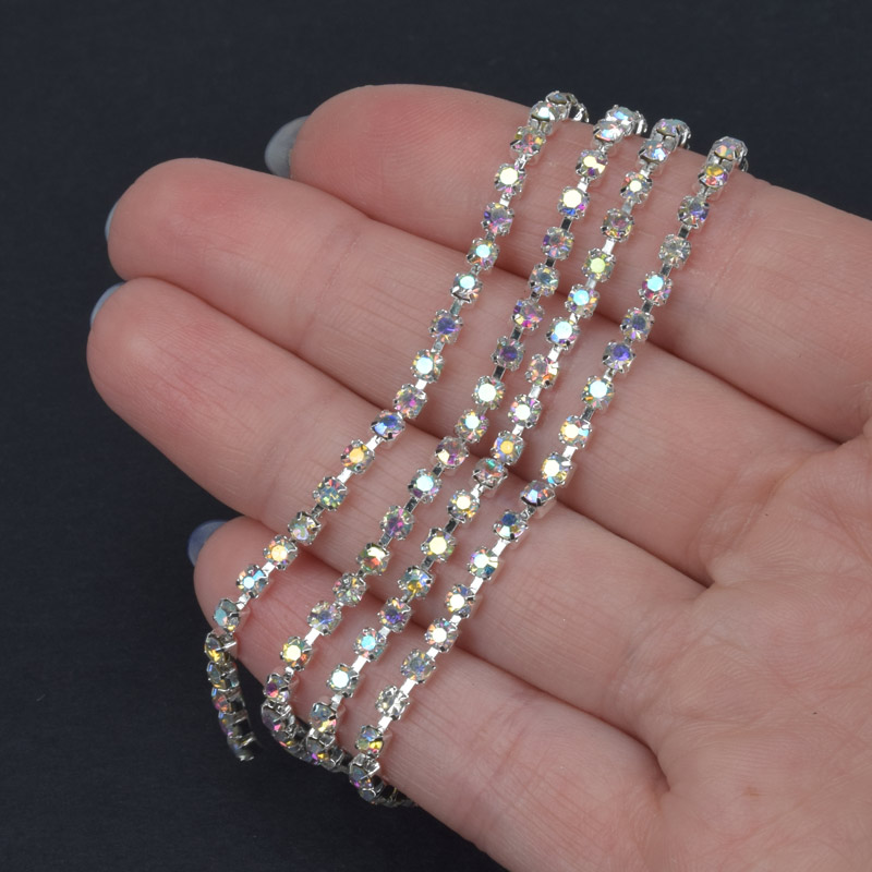 • Стразовий ланцюг SS10 (2,6 мм), Світле срібло, Стрази скляні білі АВ (ZEP-047555)