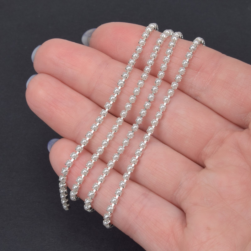 • Перлинний ланцюг SS6 (2,0 мм), Світле срібло, Перлини пластикові білі (ZEP-047553)