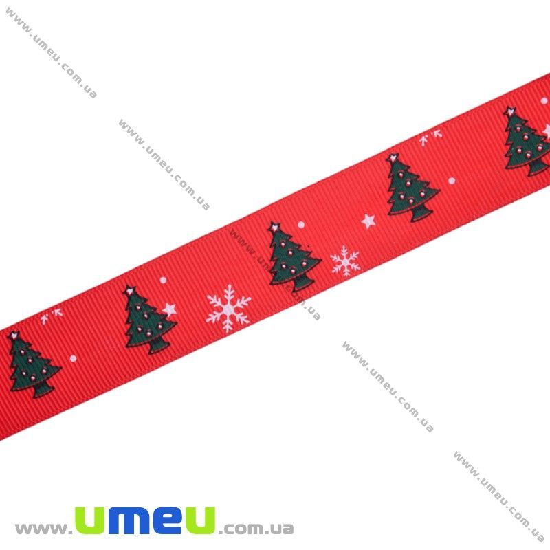 Репсова стрічка з новорічним малюнком Ялинки, 25 мм, Червона (LEN-017977) / 1 м