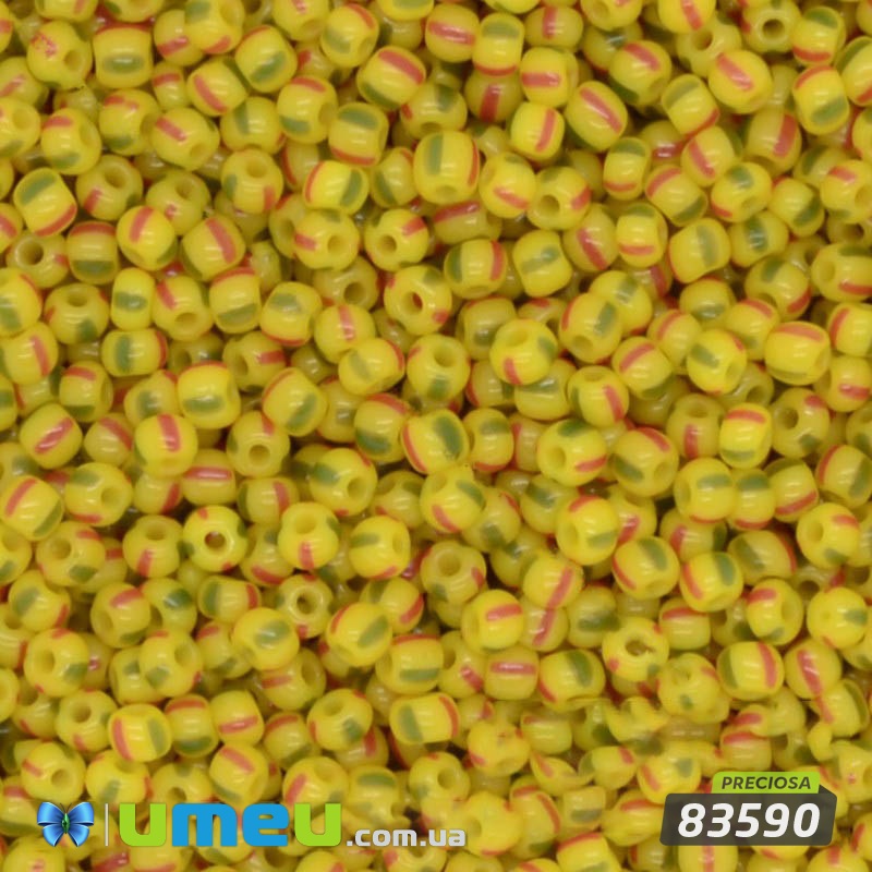 Бісер чеський №997 / 83590, Жовтий в червоно-зелену смужку, Натуральний, 10/0 (BIS-019568) / 1 уп (5 г)