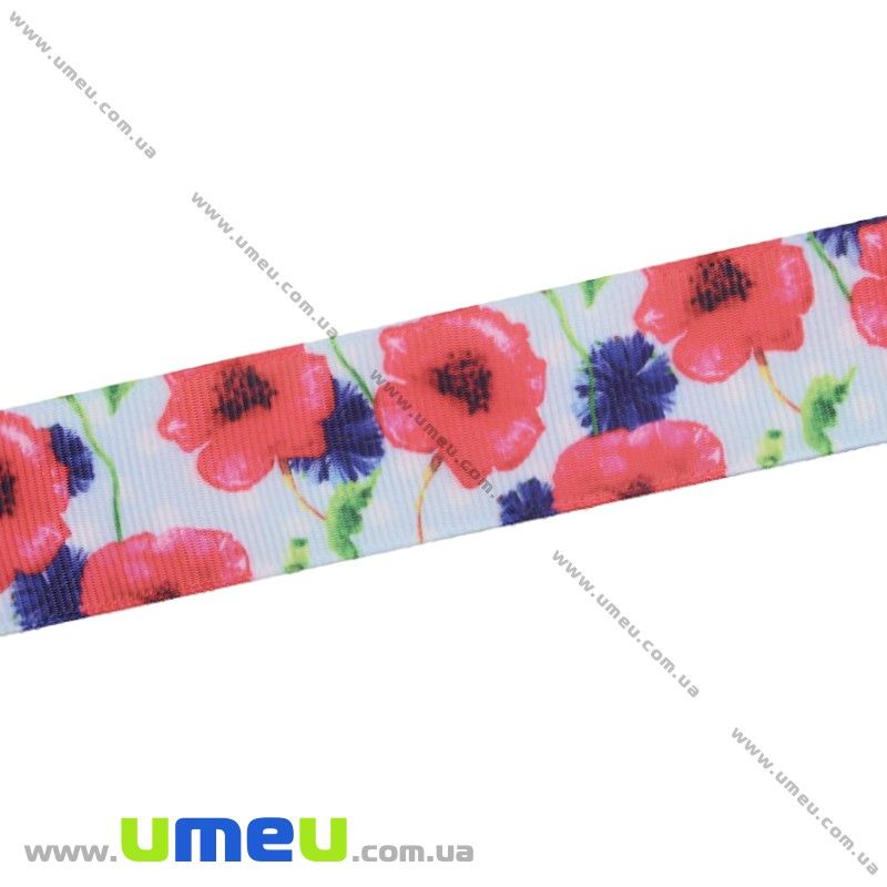 Репсова стрічка з малюнком Квіти, 25 мм, Блакитна (LEN-025652) / 1 м