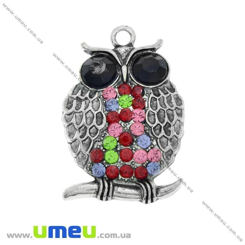 Підвіска метал. Сова з різнокольоровими стразами, 41х28 мм, Античне срібло (POD-028269) / 1 шт