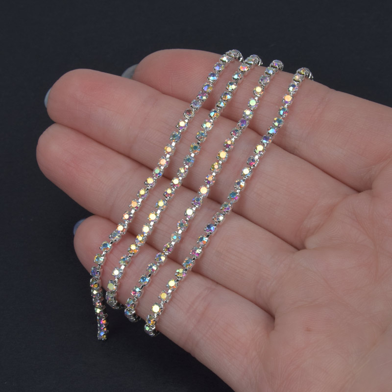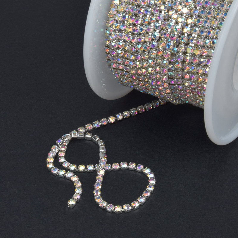 Стразовий ланцюг SS6 - 2,0 мм, Світле срібло, Стрази скляні білі АВ (ZEP-036408) / 1 м