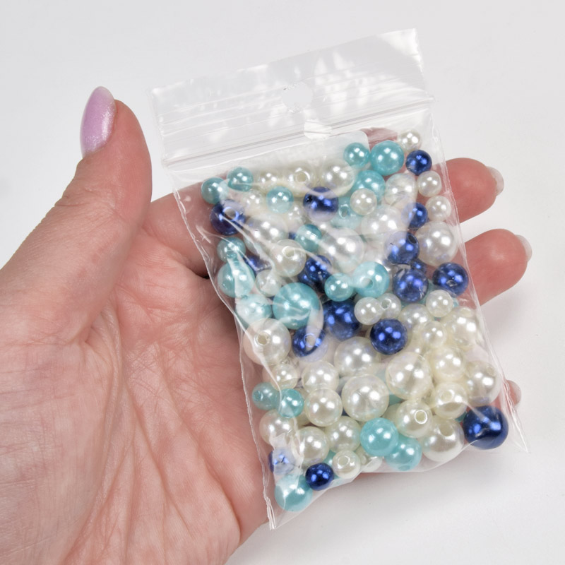 Бусины пластиковые Круглые, Жемчуг, 6-10 мм, Микс бело-синий (BUS-059767)