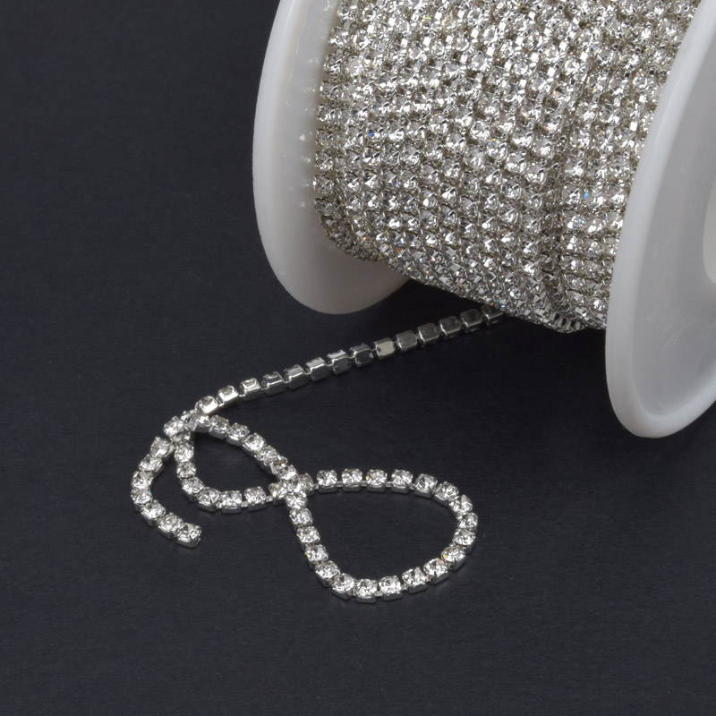Стразовая цепь SS6 - 2,0 мм, Светлое серебро, Стразы стеклянные белые (ZEP-036410) / 1 м