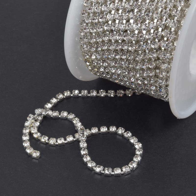 Стразовая цепь SS10 (2,6 мм), Светлое серебро, Стразы стеклянные белые (ZEP-039956) / 1 м