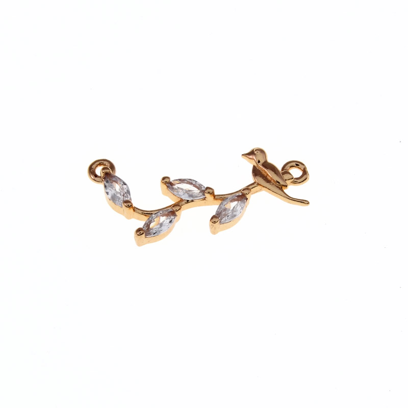 Коннектор металлический Птичка на ветке, 25х11 мм, Куб. цирконий, Золото (KON-055499) / 1 шт