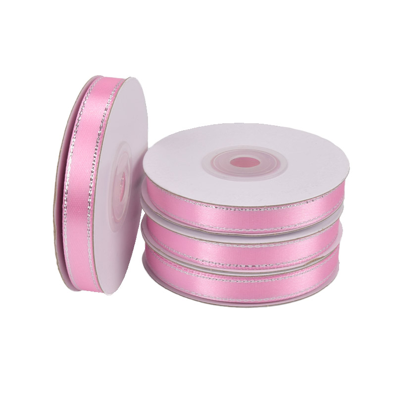 Атласная лента с люрексом, 10 мм, Розовая с серебром (LEN-061073) / 1 моток (22 м)