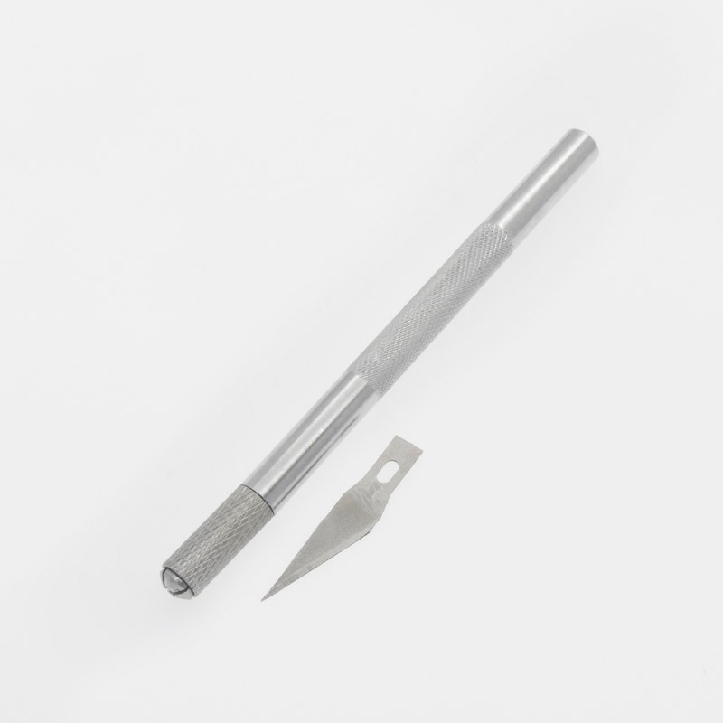 В набор входит: макетный нож, колпачёк и 6 сменных лезвий в пластиковой колбе.