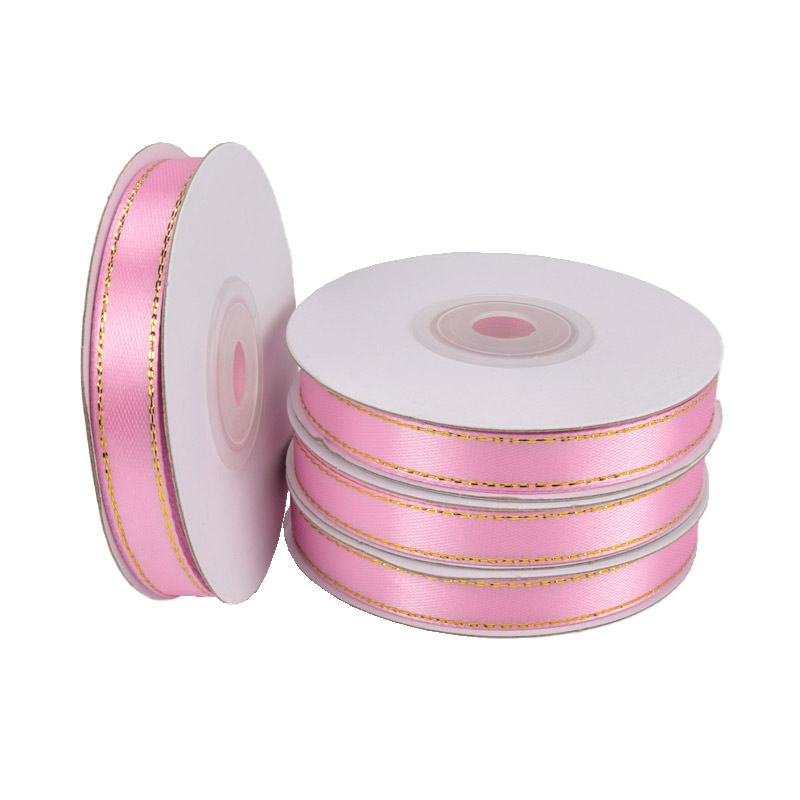 Атласна стрічка з люрексом, 10 мм, Рожева з золотом (LEN-016732) / 1 моток (22 м)