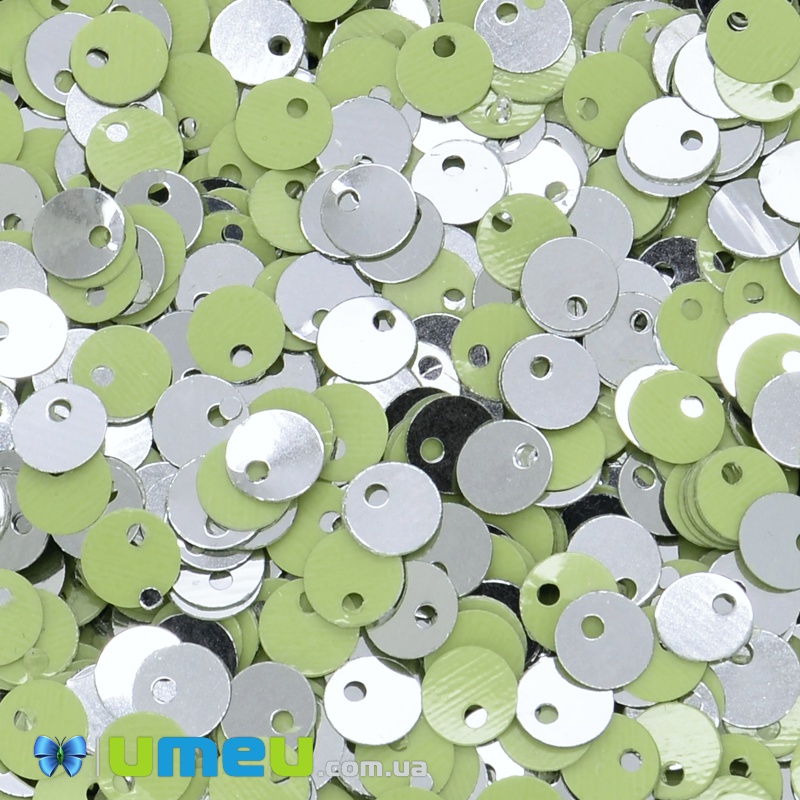 Паєтки Індія круглі плоскі (зміщений отвір), 5 мм, Серебристо-салатові (PAI-037443) / 1 уп (5 г)