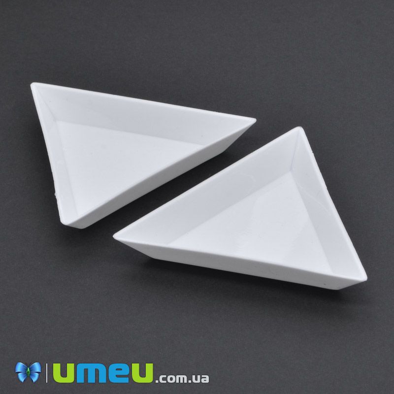 Трикутний пластиковий лоточок для роботи з бісером, намистинами, паєтками та іншими дрібними, сипучими матеріалами. Дуже зручний в роботі, адже всі дрібні деталі легко набирати на голку або брати інструментом, при цьому бісер, намистини і інші матеріали не будуть розсипатися по Вашому робочому столу. За рахунок зручної трикутної форми, після закінчення роботи, Ви з легкістю можете зсипати інші дрібні матеріали назад у пакетики або інші органайзери.