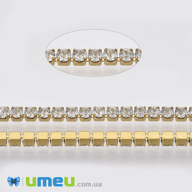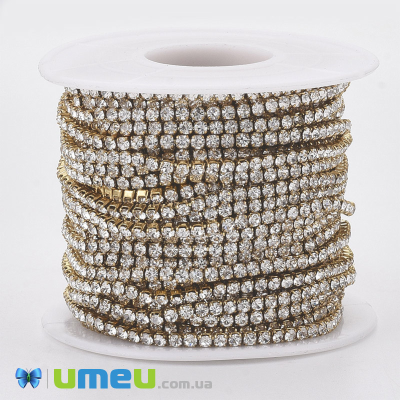 Стразовий ланцюг SS6 - 2,0 мм, нерж. сталь золото, Стрази скляні білі (ZEP-040486) / 1 м