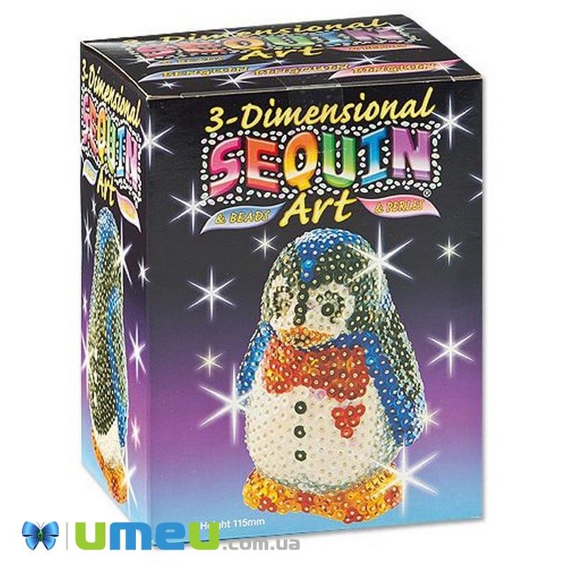 Набір допоможе створити фігурку пінгвіна з блискіток. Всі необхідні матеріали та інструменти в комплекті, не потрібно нічого додаткового. Зокрема, в наборі знайдете: блискітки різних кольорів, шпильки, форма основи з пінопласту, інструкція. Процес виготовлення тривимірної фігурки пінгвіна нескладний і одночасно дуже захоплюючий. Готовий виріб буде радувати око; пінгвінчиком можна гратися, або ж подарувати рідним як сувенір. Розмір пінгвіна - 11,5 см. Набір призначений для дітей від 8 років.