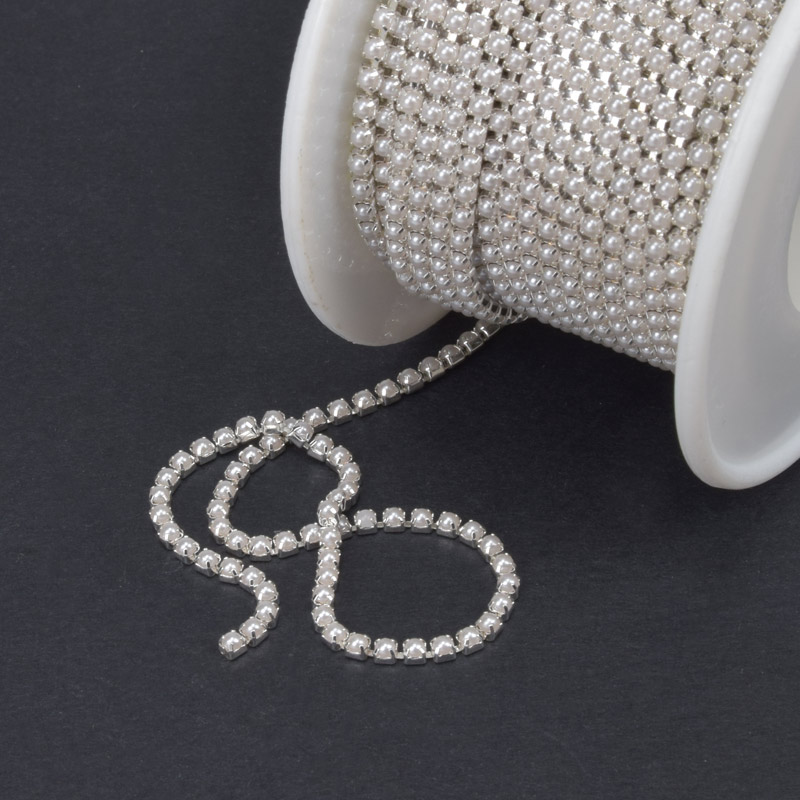 Перлинний ланцюг SS6 (2,0 мм), Світле срібло, Перлини пластикові білі (ZEP-047553) / 1 м