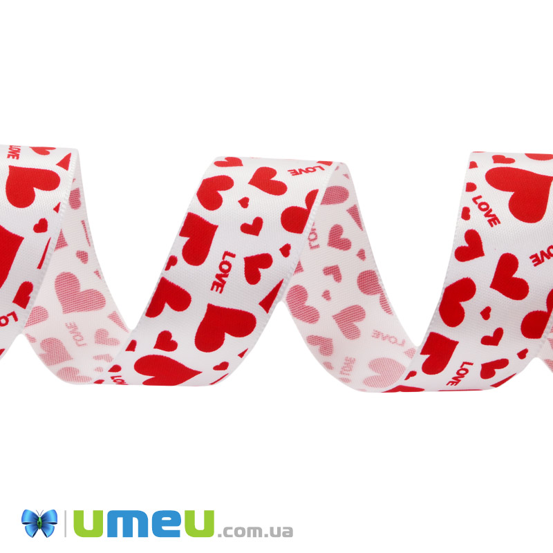 Атласна стрічка Серця, 25 мм, Біла (LEN-048590) / 1 м