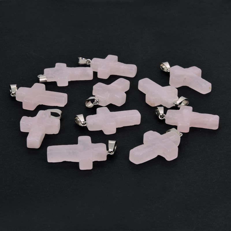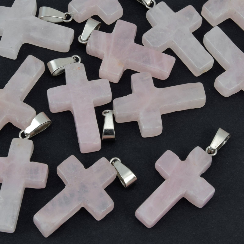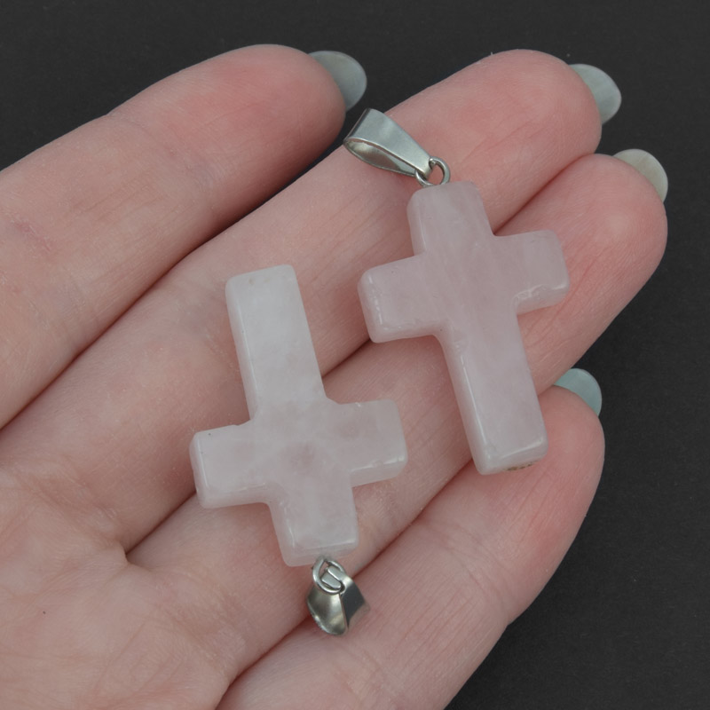 Підвіска Хрест, Натур. камінь Кварц рожевий, 30х20х6 мм (POD-057952) / 1 шт
