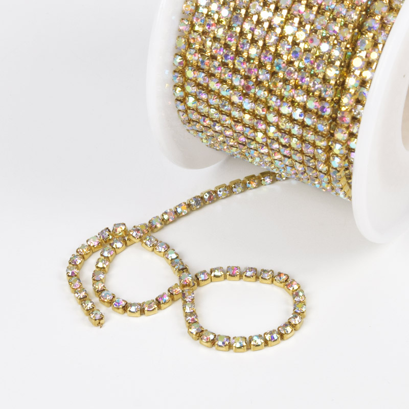 Стразовий ланцюг SS8 (2,4 мм), Золото, Стрази скляні білі АВ (ZEP-061013) / 1 м