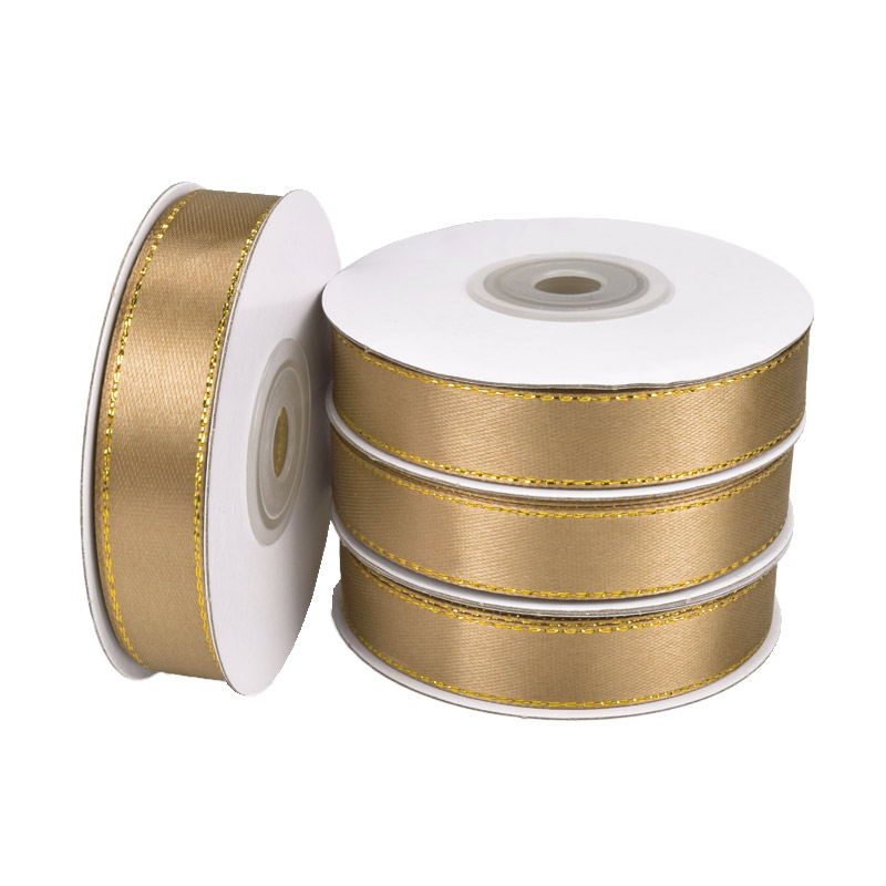 Атласна стрічка з люрексом, 15 мм, Коричнева з золотом (LEN-061078) / 1 моток (22 м)