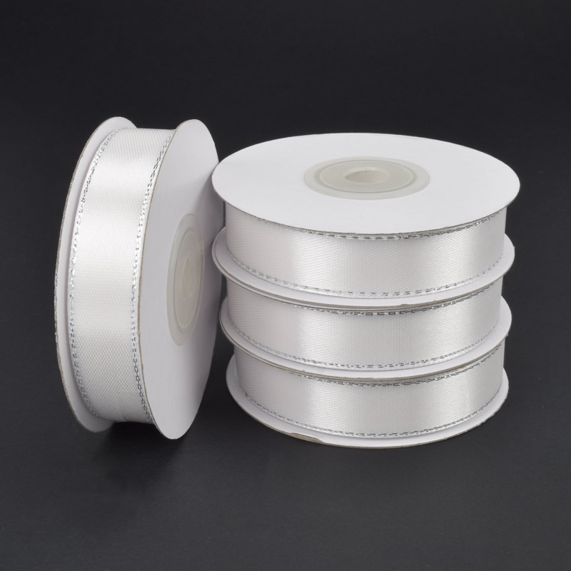 Атласна стрічка з люрексом, 15 мм, Біла зі сріблом (LEN-061080) / 1 моток (22 м)