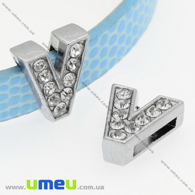 Намистина мет., Буква V зі стразами, 12х11 мм, Темне срібло (BUS-008863) /
