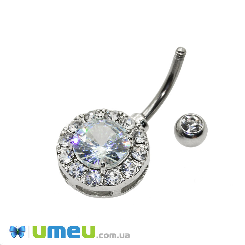 Серьга для пирсинга пупка из нержавеющей стали 29х13 мм, диаметр основы со стразами 13 мм. Стразы стеклянные.