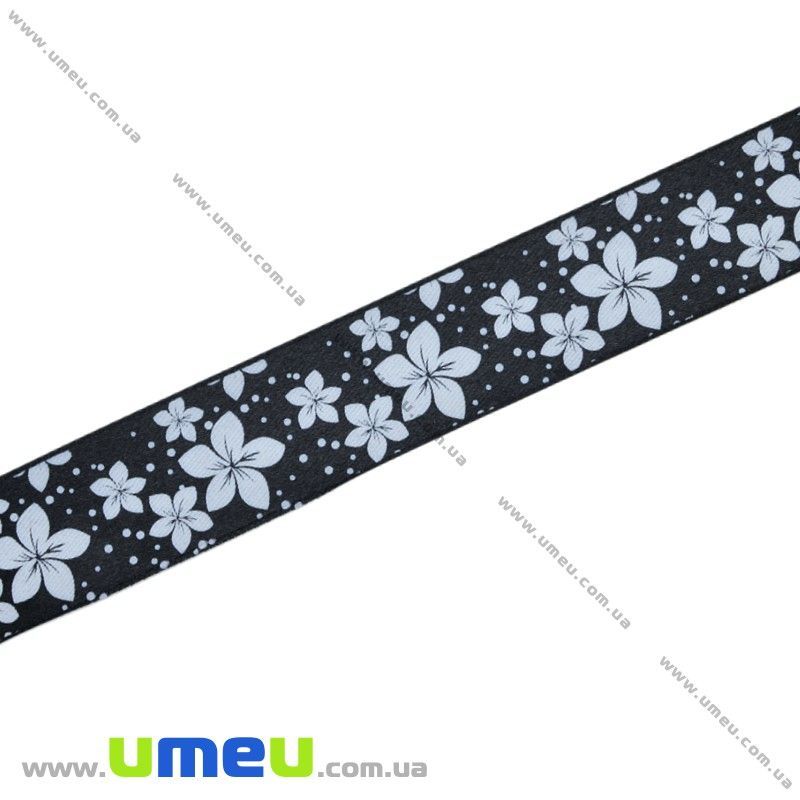 Атласная лента Цветы, 25 мм, Черная (LEN-019655) / 1 м