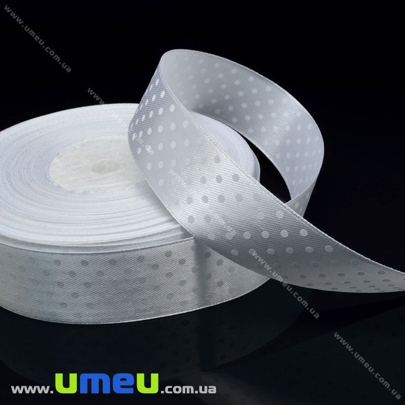 Атласная лента в горошек, 25 мм, Белая (LEN-029813) / 1 м