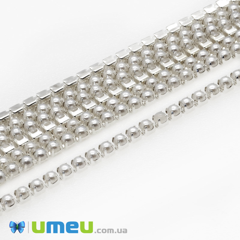 Жемчужная цепь SS8 (2,4 мм), Светлое серебро, Жемчужины пластиковые белые (ZEP-044853) / 1 м