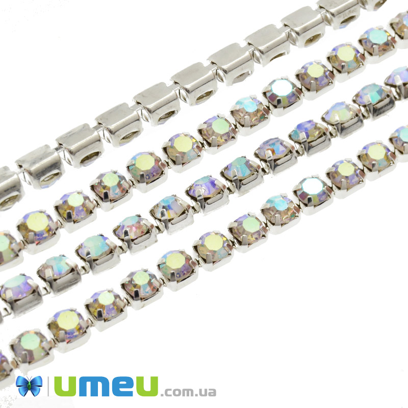 Стразовая цепь SS14 - 3,2 мм, Светлое серебро, Стразы стеклянные белые АВ (ZEP-047566) / 1 м