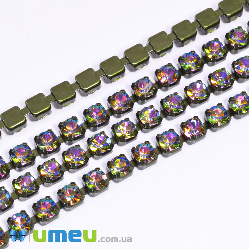 Стразовая цепь SS12 (2,8 мм), Ирис зеленая, Стразы стеклянные ирис (ZEP-049289) / 1 м