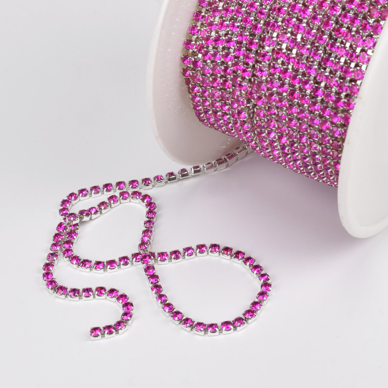 Стразовая цепь SS6 (2,0 мм), Светлое серебро, Стразы стеклянные малиновые (ZEP-061015) / 1 м