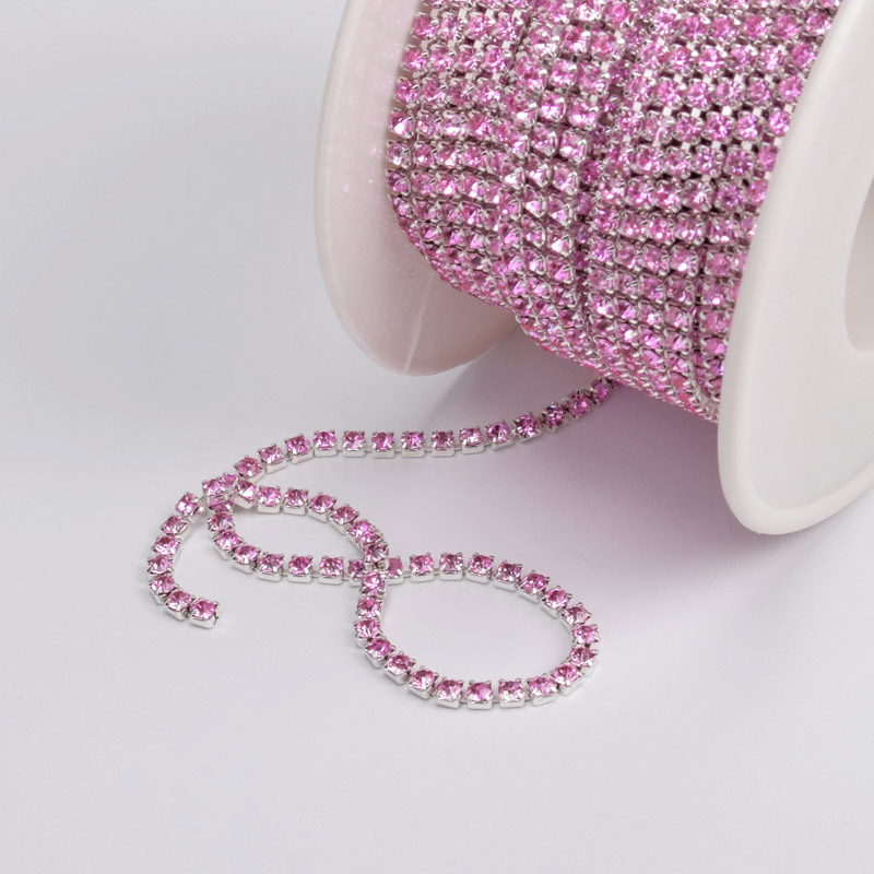 Стразовая цепь SS6 (2,0 мм), Светлое серебро, Стразы стеклянные розовые (ZEP-061016) / 1 м