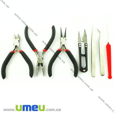 В набор входят: кусачки, круглогубцы, тонкогубцы, ножницы для обрезки нитей, пинцет загнутый, пинцет ровный, шило, кольцо для открытия соединительных колечек, пенал.